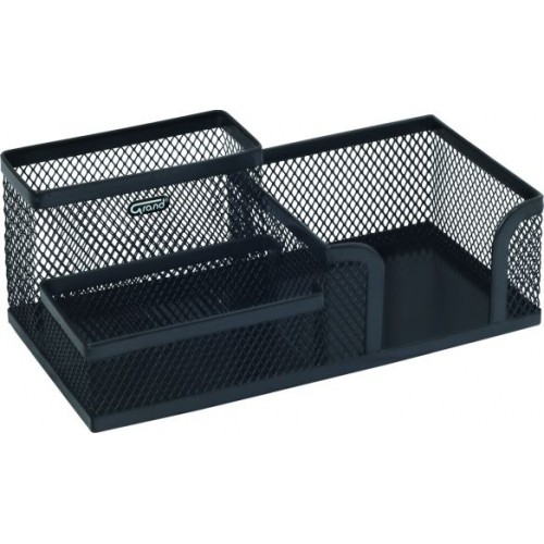 Trzykomorowy przybornik wykonany z metalu lakierowanego na kolor czarny, wzór siateczkowy, pasuje do innych przyborników kolekcji VIP, do układania różnych podręcznych drobiazgów, wymiary: 82x102x203 [mm], kod EAN: 5903364212247, jednostka sprzedaży: 1 szt.