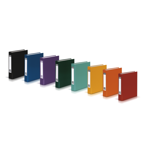 Segregator ringowy wykonany z grubej tektury, pokryty ekologiczną folią polipropylenową, wewnątrz biała wyklejka papierowa, 2-pierścieniowy mechanizm w kształcie litery O, szerokość grzbietu: 40mm, format: A5, kolor czarny.